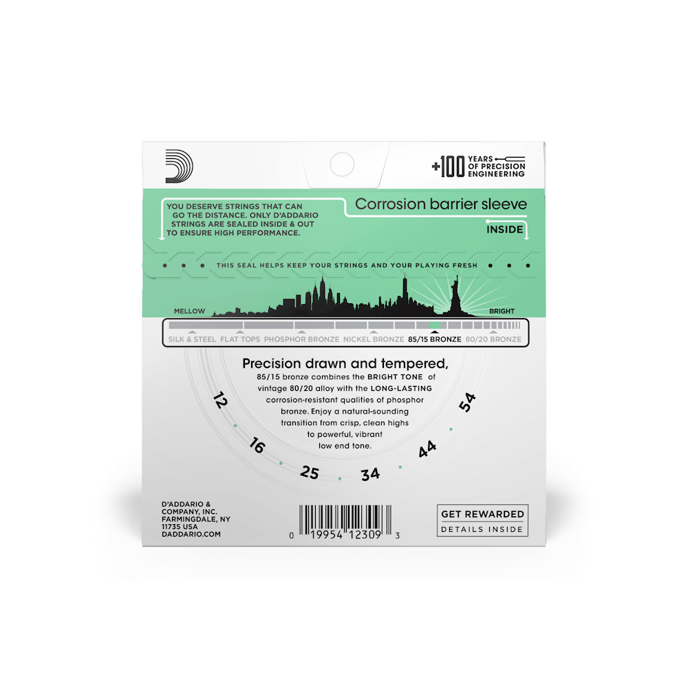 The 85/15 Bronze wrap wire is precision wound onto a carefully drawn, hexagonally shaped high carbon steel core, resulting in long lasting, bright sounding tone with excellent intonation.